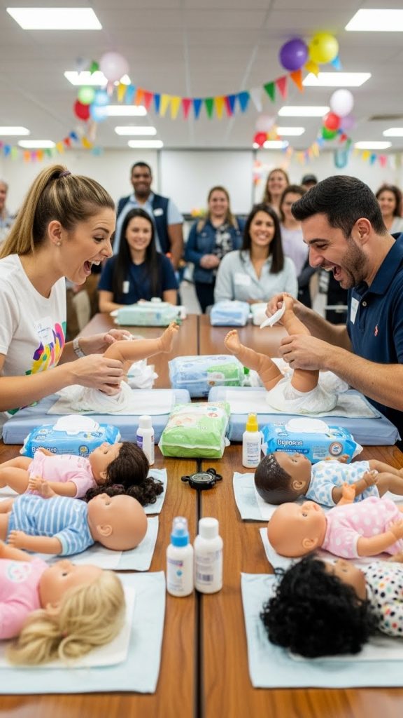 The Diaper Changing Race is a humorous and active game that tests participantsโ€™ speed and accuracy in a practical baby-care task. Set up several dolls, diapers, and wipes at stations. Participants race against the clock to complete a proper diaper change as quickly and efficiently as possible.