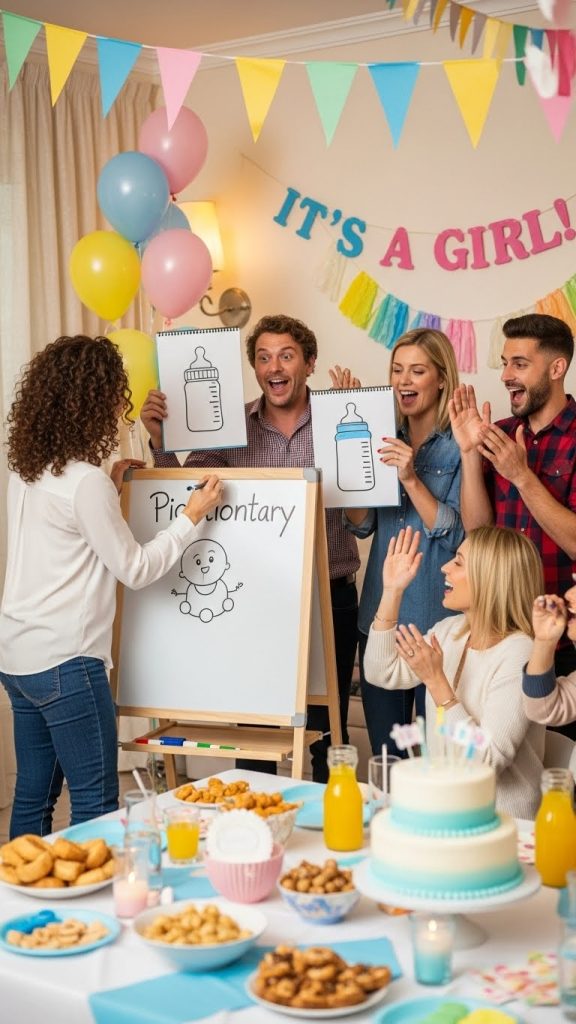 Pictionary brings creativity, artistic expression, and laughter to the baby shower. In this game, guests take turns drawing baby-related words or phrases while others attempt to guess within a time limit. Words can include โ€œcrib,โ€ โ€œstroller,โ€ โ€œpacifier,โ€ or โ€œbath time.โ€