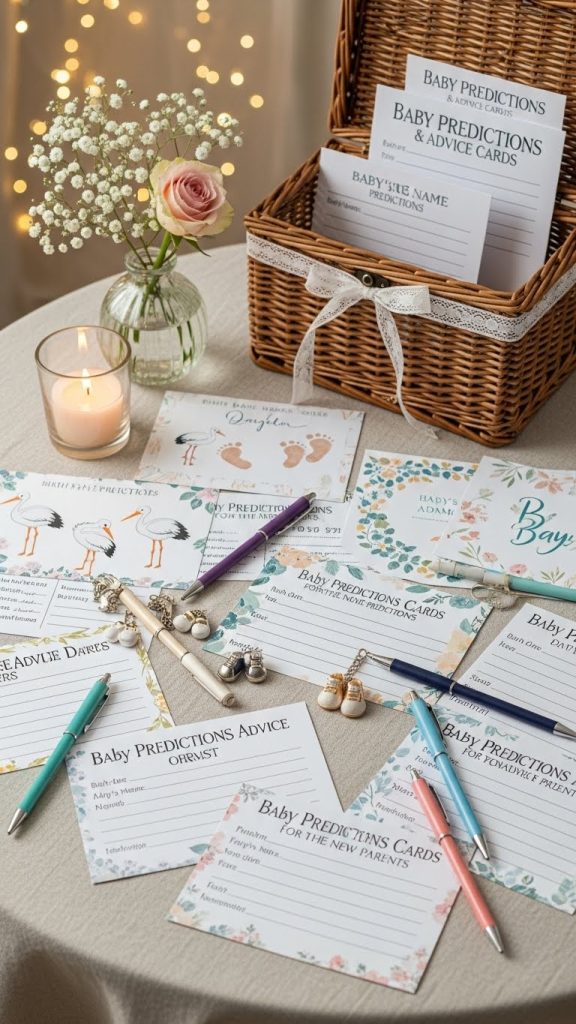 Distribute cards at the start of the shower and collect them in a decorative box or basket. During or after the shower, parents-to-be can read aloud predictions and advice, creating a sentimental and interactive experience.