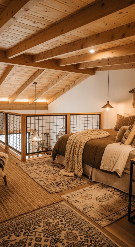 - Warm textiles like wool blankets, layered rugs, and linen bedding.