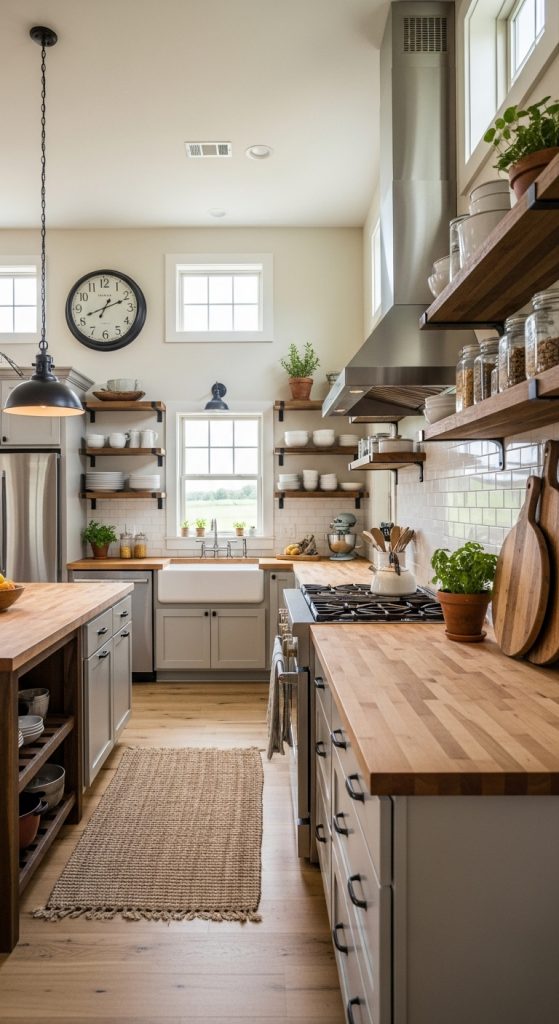 Barndominium kitchens often balance rustic charm with industrial functionality. Think butcher block countertops, metal accents, and open shelving.