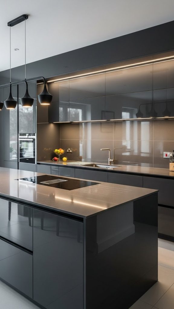 2. Dark Grey Modern Kitchen with High-Gloss Finishes