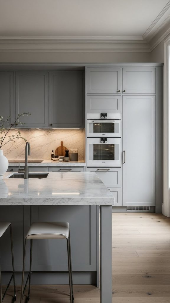 One of the most timeless luxury kitchen combinations is light grey cabinetry paired with crisp white elements and marble surfaces. This palette feels bright, elegant, and effortlessly modern.