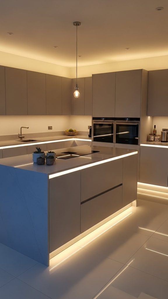 8. Soft Grey Kitchen with Integrated Lighting Design