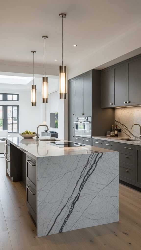 5. Grey Kitchen with Statement Island as the Focal Point