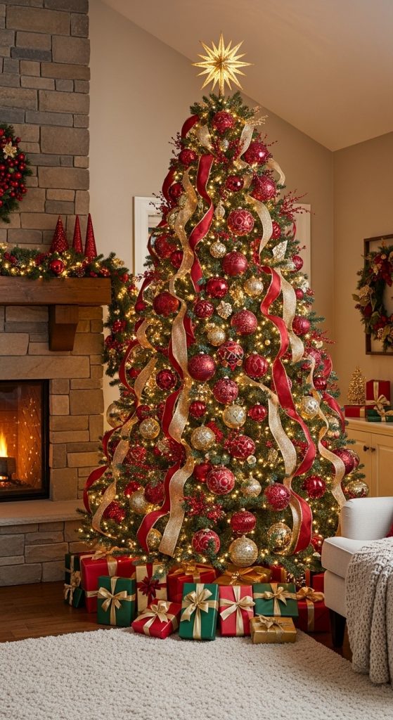 Start with a lush green tree, whether real or artificial. Begin by stringing soft white or warm yellow lights throughout the branches. Next, add shimmering gold ribbon or garland in a spiral motion around the tree. Mix in red and gold ornaments of varying sizes and textures — think shiny spheres, matte finishes, and glittery baubles.
