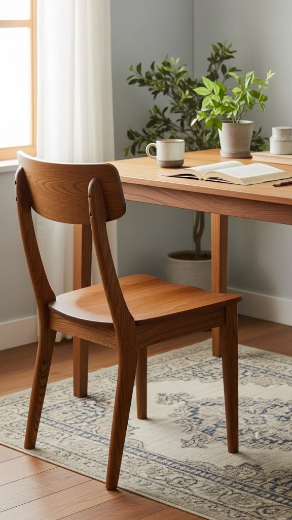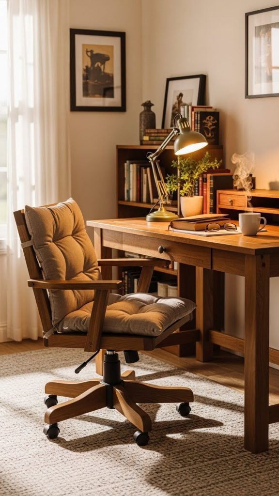 Chairs with curved backrests, angled seats, and supportive armrests provide natural alignment for the spine. When paired with a seat cushion, wooden chairs can support long hours of focused work.
