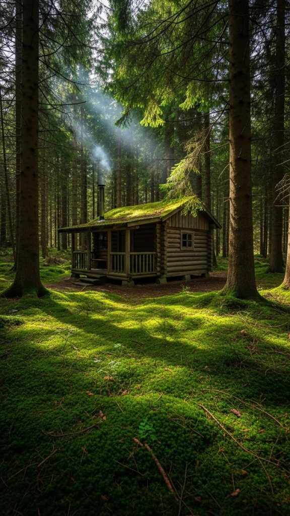 A forest cabin trip is about immersion in greenery, shadow, and stillness. Dense trees create a feeling of enclosure and protection, making the world beyond the forest feel distant and irrelevant.