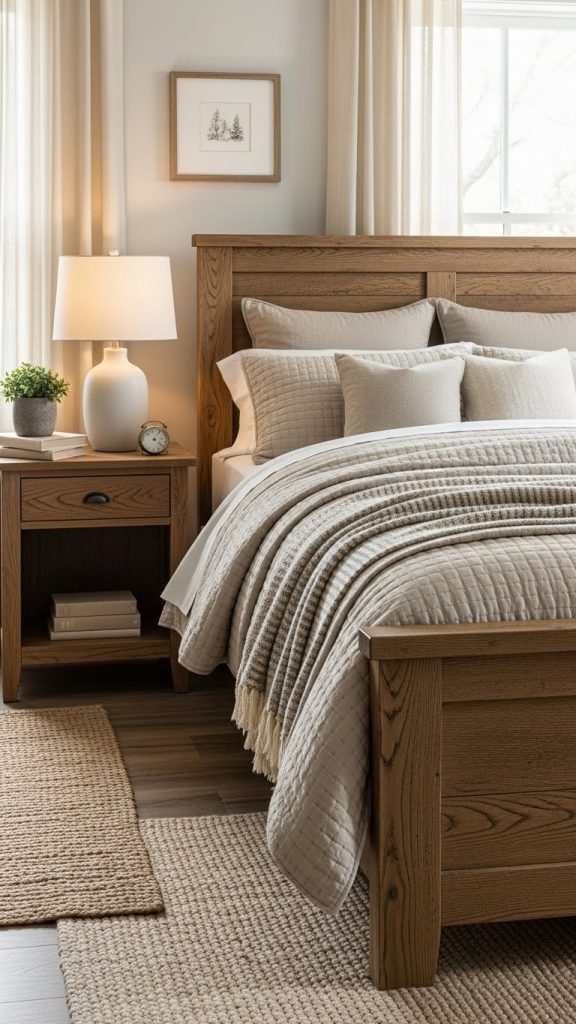 Farmhouse bedrooms rely heavily on wood to bring warmth and authenticity into the space. Furniture should feel sturdy, timeless, and slightly imperfect.