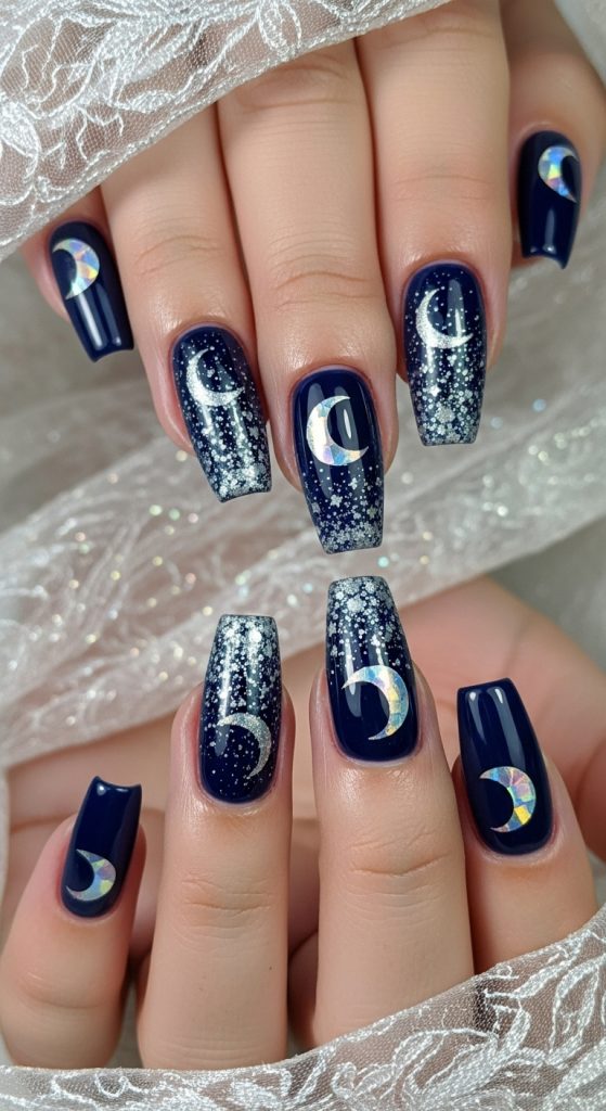 Moonlit fairy nails suit medium to long nail lengths and look beautiful in almond or stiletto shapes. This style is perfect for night events, winter seasons, or anyone who loves a magical cosmic aesthetic.