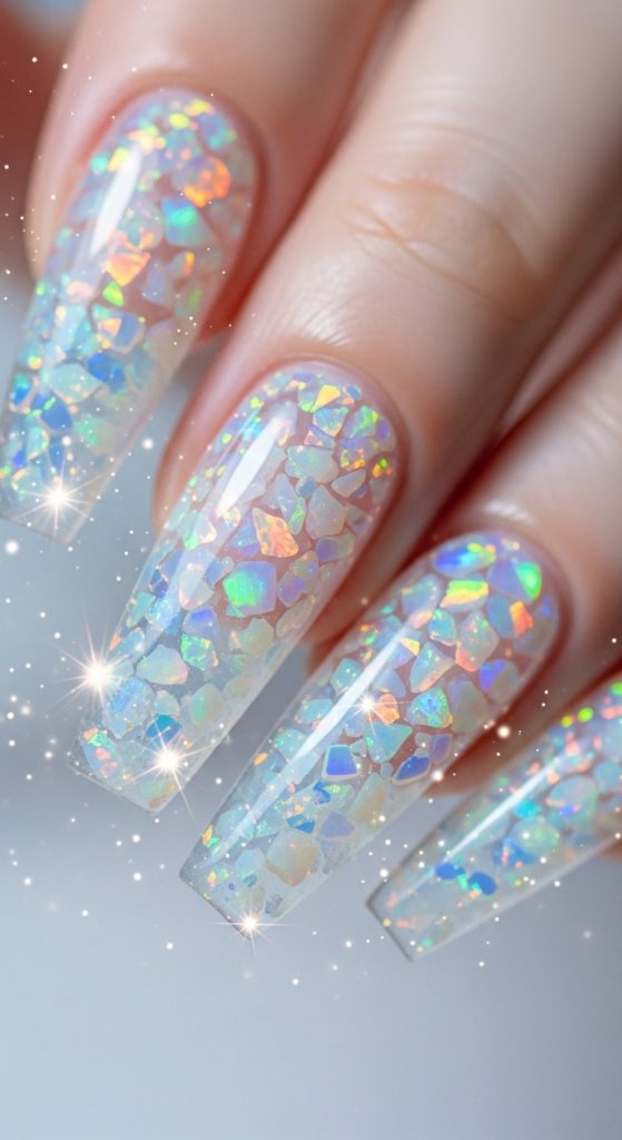 These nails usually start with a soft pastel or nude base. Large crystals are then placed strategically near the cuticle or across the entire nail. Smaller gems can be sprinkled to create a cascading effect. Add chrome powder or holographic glitter beneath the gems for a dimensional shimmer.