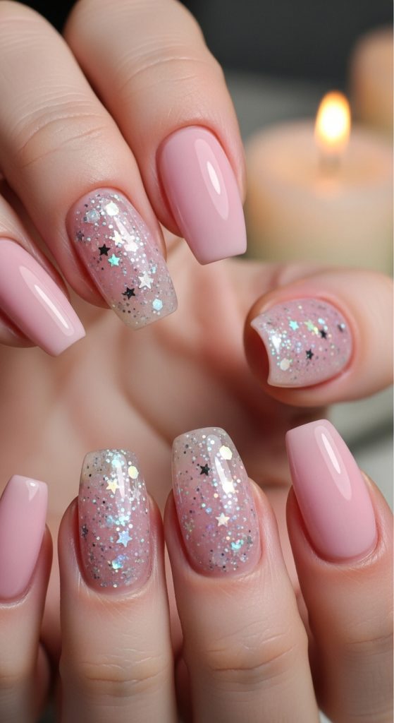 Start with a pink base and add accents like white lace designs, tiny pearls, floral elements, or iridescent shimmer. Soft chrome overlays give a fairy-wing glow. Micro glitter sprinkled along the edges of the nails adds a magical dust effect.