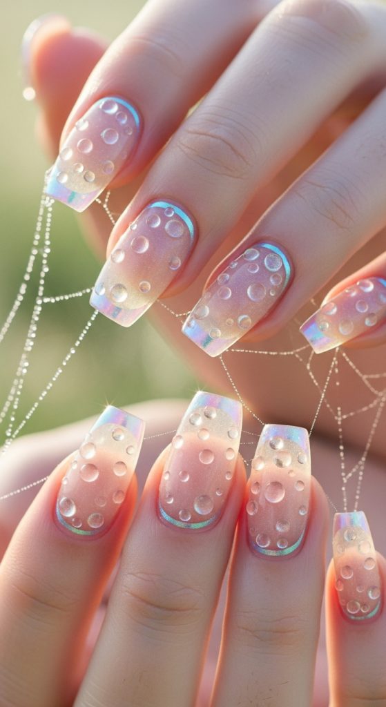 Iridescent nails are the epitome of fairy-inspired beauty. These nails often mimic the delicate shimmer of fairy wings, using colors that shift from pink to lavender to blue depending on the light. The effect is ethereal, dreamy, and instantly magical.