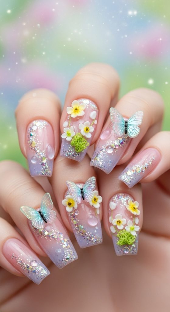 Cottagecore fairy nails combine the charm of the countryside with magical fairy beauty. These nails focus on natural soft shades—nudes, peaches, sage, soft yellow, lavender—combined with whimsical details like tiny flowers, butterflies, subtle sparkles, and natural textures.