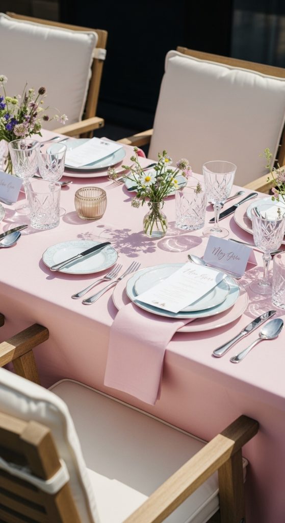 Start with a coordinating tablecloth or runner, then layer plates, cutlery, and glassware according to your theme. Rustic parties might feature wooden chargers and mason jar glasses, while elegant tea parties could include fine china and crystal glasses.