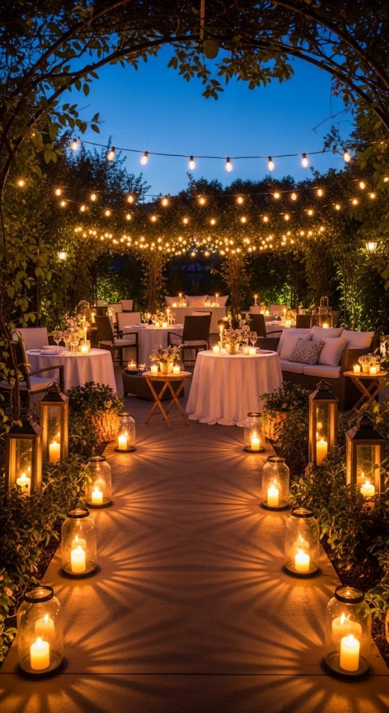 Candles and lanterns create a warm, intimate ambiance, especially as daylight fades. Use glass hurricane lanterns, mason jar candles, or LED flameless candles to ensure safety.