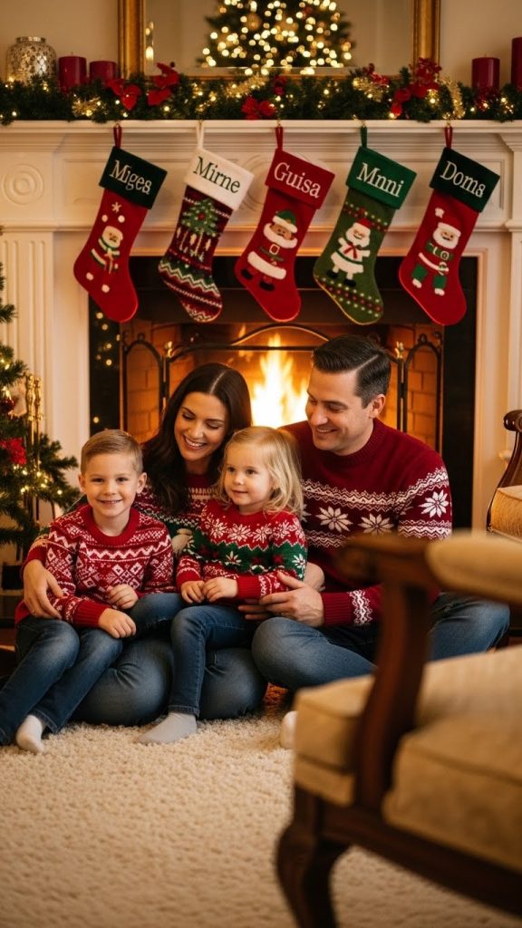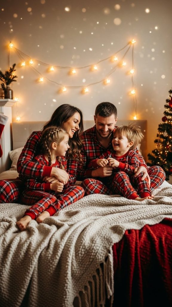 Matching family pajamas or coordinated loungewear give a unified look. Incorporate natural interactions like reading a Christmas storybook, sharing hot cocoa, or playing with pillows to create spontaneous expressions. For couples, sitting close together, leaning into each other, or holding warm drinks creates gentle romantic warmth.