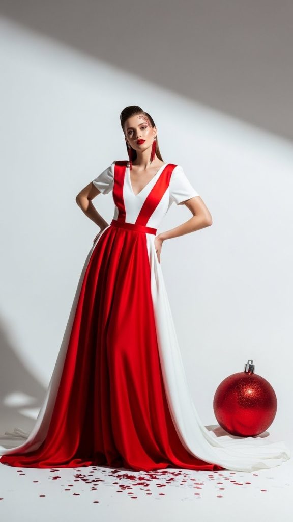Lighting should be polished and bright, emphasizing contrast between the red and white elements. Angled poses, close-ups with ornaments, and full-body compositions allow diverse creative expression. This style blends holiday mood with high fashion, making the photographs visually striking.