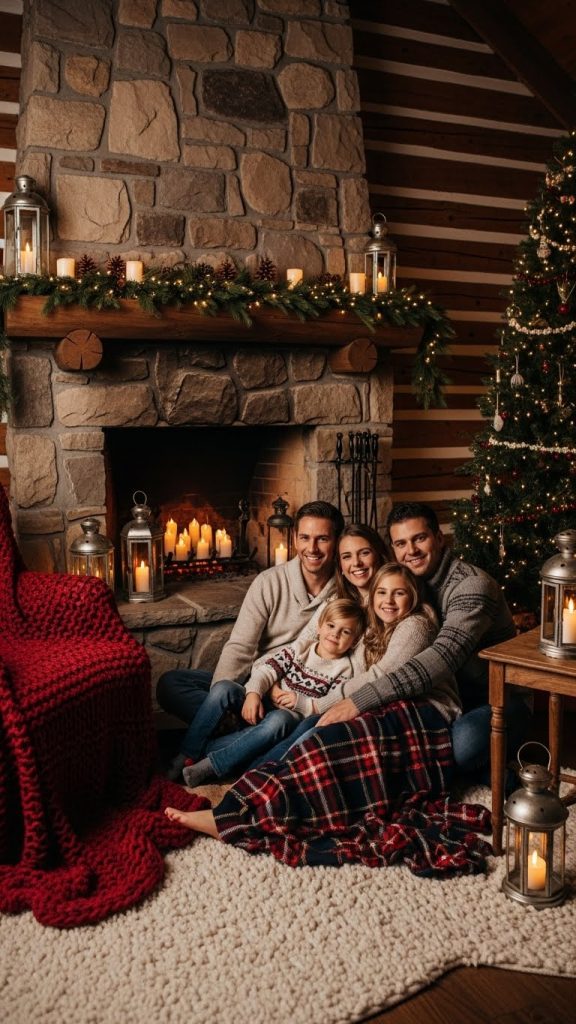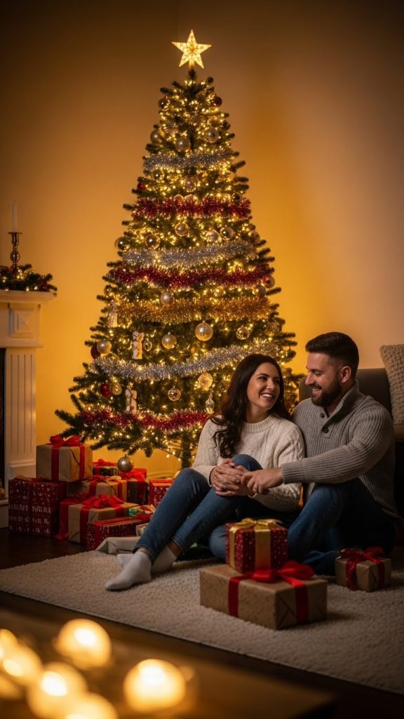 This setup is ideal for couples or families who want photographs that feel relaxed, lived-in, and emotionally rich. It captures the essence of winter evenings spent together. Even non-holiday props such as books or warm drinks contribute to the narrative of comfort and togetherness.