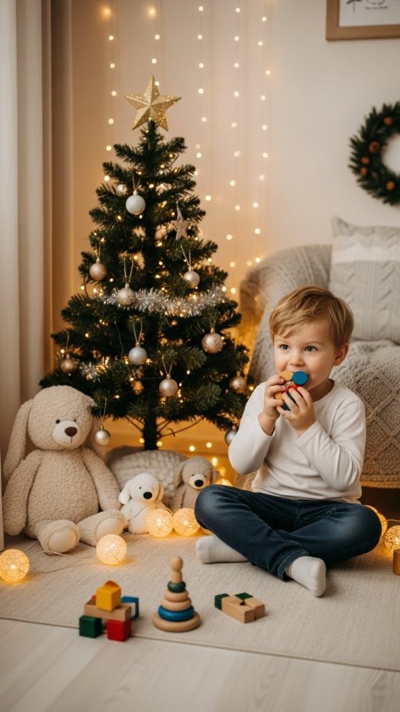 Children can decorate their mini tree, play with toys, or sit surrounded by holiday books. Capture natural reactions, laughter, and curiosity. These expressive moments are best photographed with fast shutter speed and a wide aperture to keep the child in focus while the background softly blurs.