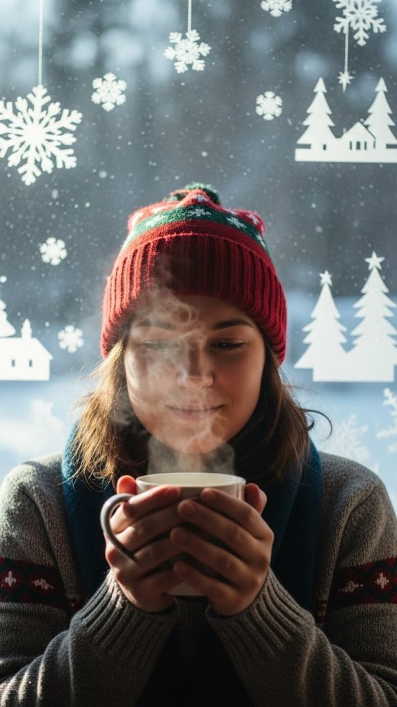 A window decorated with garlands, snowflake decals, or frost-inspired spray creates a magical indoor lighting opportunity. Position the subject where natural light softly wraps around their face, creating a luminous portrait style that feels serene and cinematic.