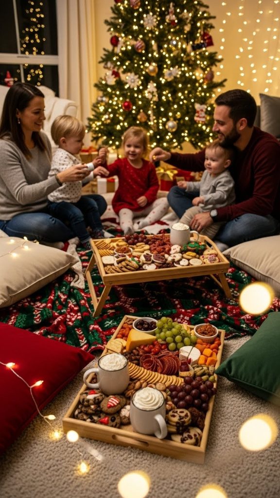 An indoor Christmas picnic offers a charming, casual, and creative idea that captures warmth and family connection. A cozy setup with soft blankets, cushions, wooden trays, snacks, cookies, and warm drinks creates an inviting scene. A decorated tree or garlands in the background add festive flair.