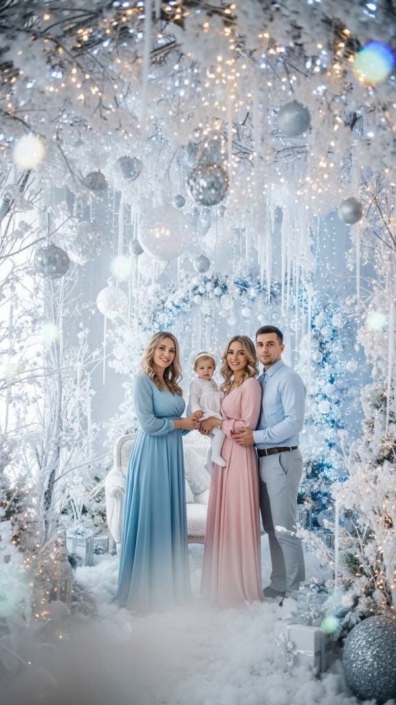 Photographers can incorporate props such as faux snowballs, small sleds, or white lanterns. Children can engage in playful poses, while adults can enjoy serene, elegant portraits against the winter-themed background. The key is to achieve a balance between simplicity and fantasy, keeping the focus on both the subject and the magical environment.