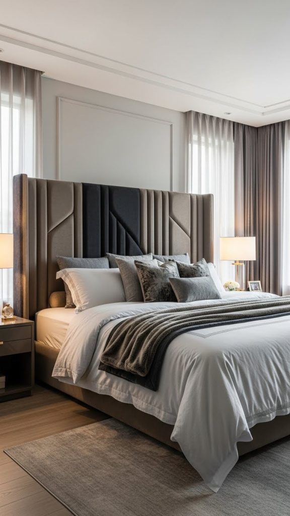 This approach works particularly well in large bedrooms where the bed needs to anchor the space visually. A bold headboard draws attention and balances the roomโs proportions.