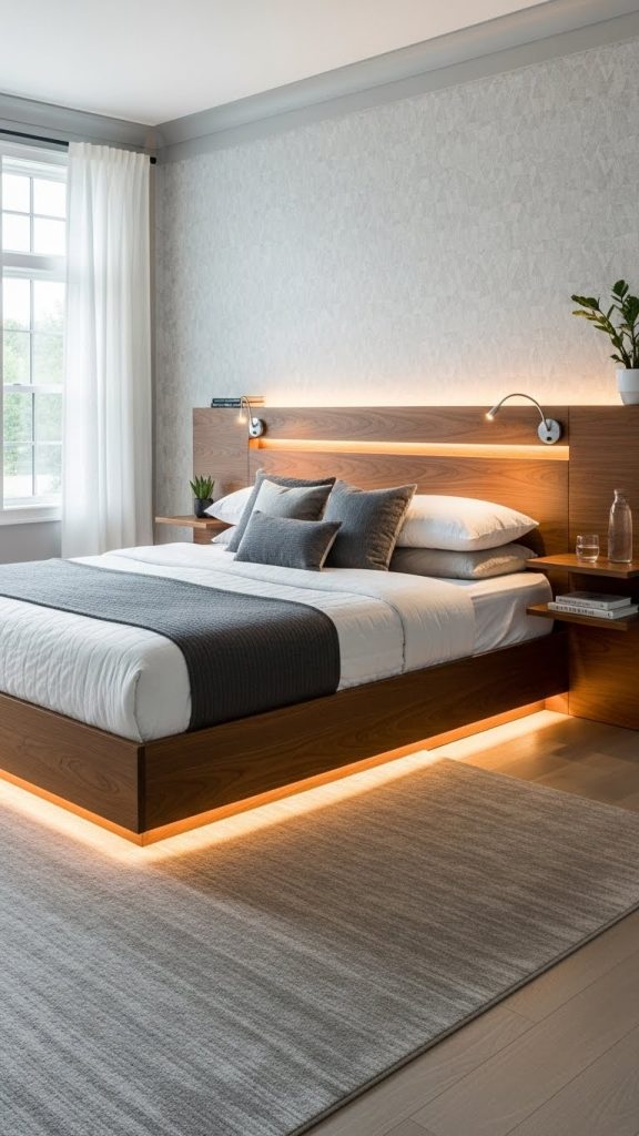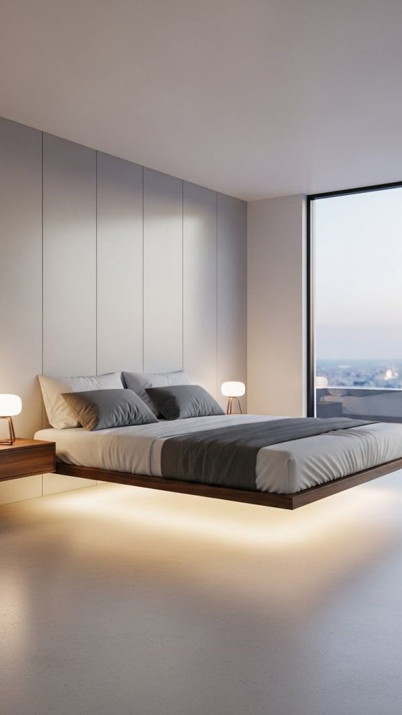 Often paired with integrated LED lighting beneath the frame, floating beds add subtle drama and ambient glow. Materials are typically sleek, such as wood veneers, matte finishes, or upholstered bases.