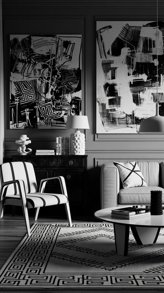 Lighting is critical here. Warm lamps, reflective surfaces, and layered lighting add depth and comfort. Textiles in grey or beige help soften transitions between black and white.