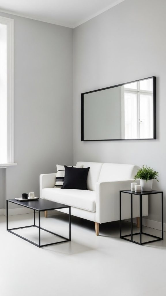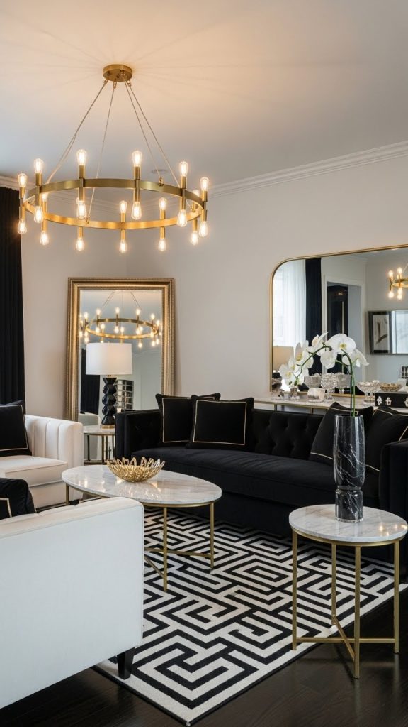 Mirrors, light walls, and open layouts prevent contrast from becoming overwhelming. Vertical black accents, like lamps or shelving, add structure without crowding.