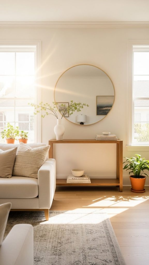- Use tall mirrors behind sofas or consoles for elegance.