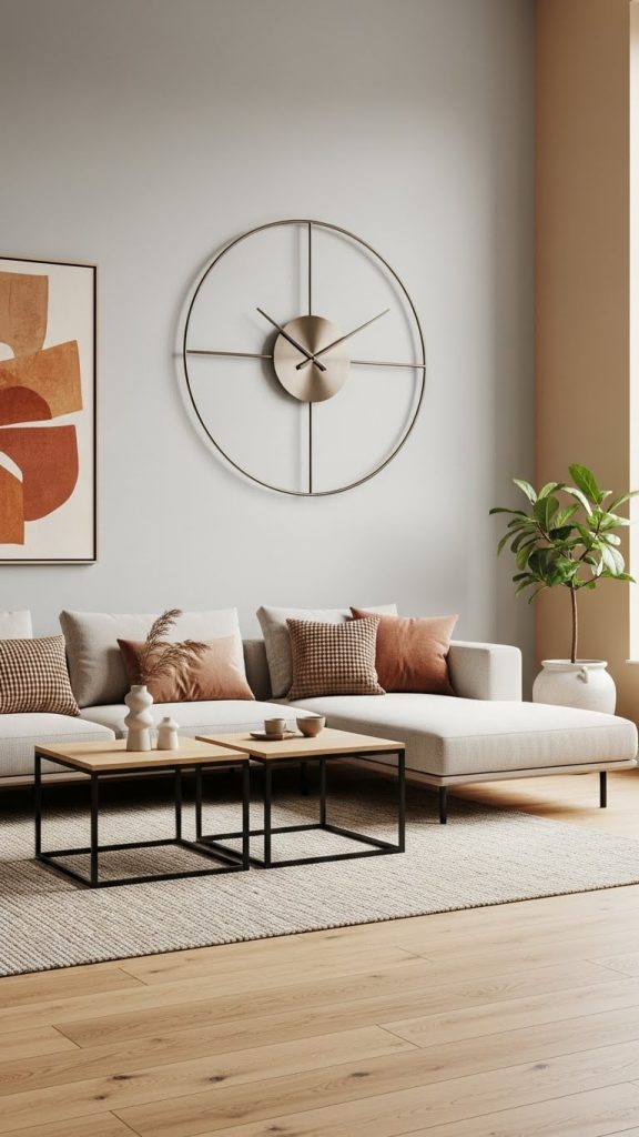 A large decorative clock can be both functional and artistic. Modern wall clocks are designed as statement pieces that anchor the living room visually.