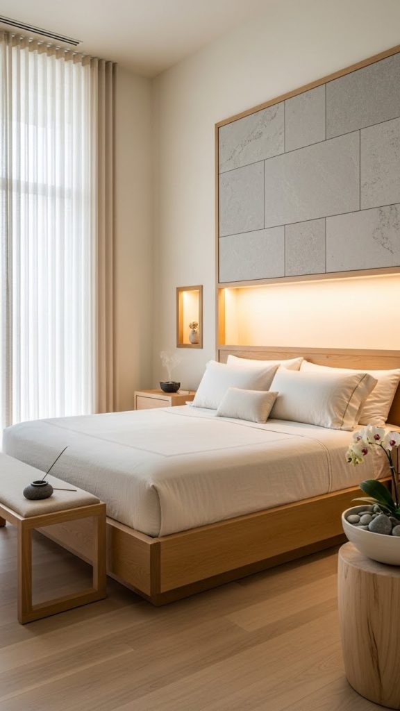 Strategic lighting enhances the spa-like ambiance. Soft, diffused fixtures, floor lamps, and warm LEDs create a relaxing glow. Small water features, aromatherapy diffusers, or nature prints complement the aesthetic without cluttering the space. The emphasis is on fostering peace and connection to natural serenity. This style is ideal for those seeking daily relaxation through a minimalist yet luxurious environment.