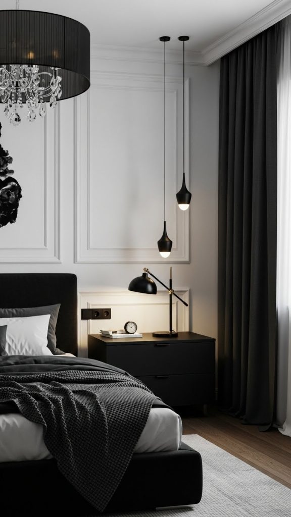 Black accents against white walls create instant drama and sophistication. This high-contrast approach is bold yet controlled, making it perfect for moody bedroom design.