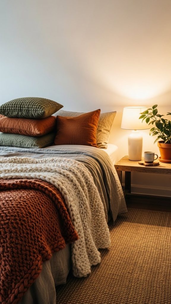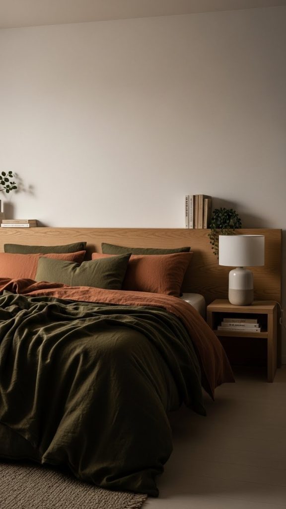 Colors such as terracotta, clay, rust, olive, and warm brown are introduced through bedding, rugs, cushions, or artwork. These tones create emotional warmth and visual richness.
