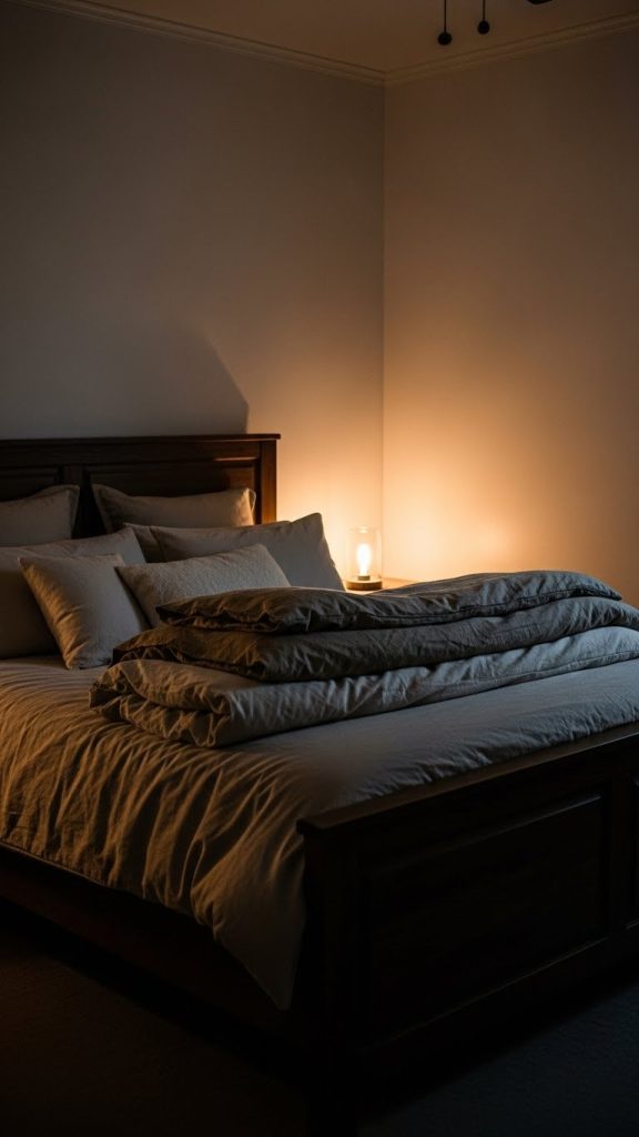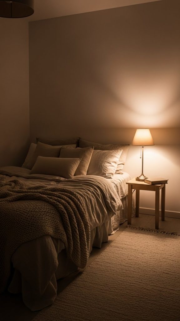 9. Cozy Moody Bedroom with Low Light and Soft Whites