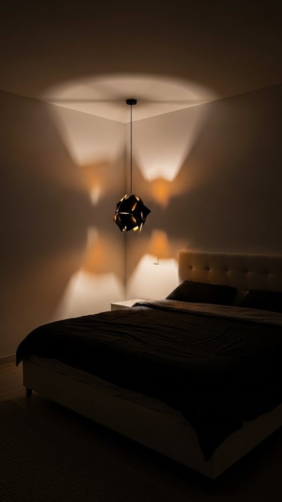Large pendant lights, sculptural lamps, or wall sconces with directional light create areas of brightness and shadow. The contrast between illuminated zones and darker corners adds mood without changing wall color.