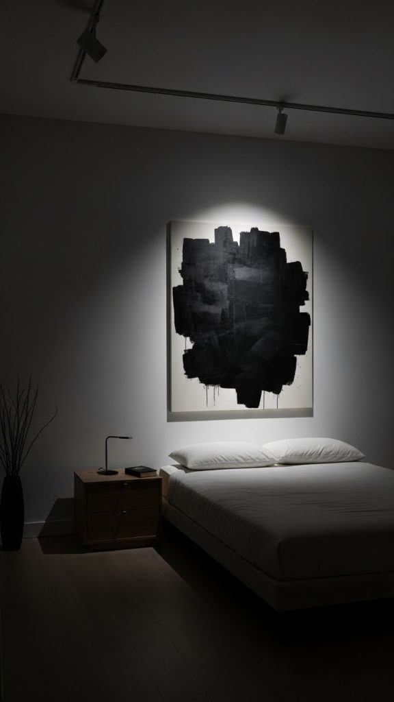 Artwork can be a powerful tool for creating mood, especially in white-walled bedrooms. Large-scale or dark-toned art introduces emotional weight and focus.