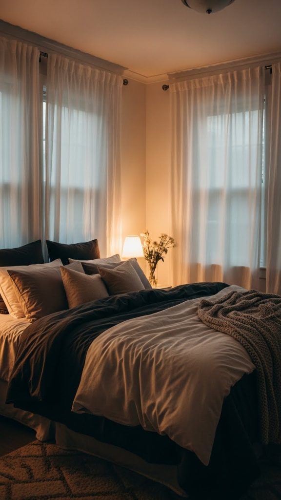This style is ideal for those who want a cozy, cocoon-like bedroom without dark paint, relying instead on touch, softness, and atmosphere.