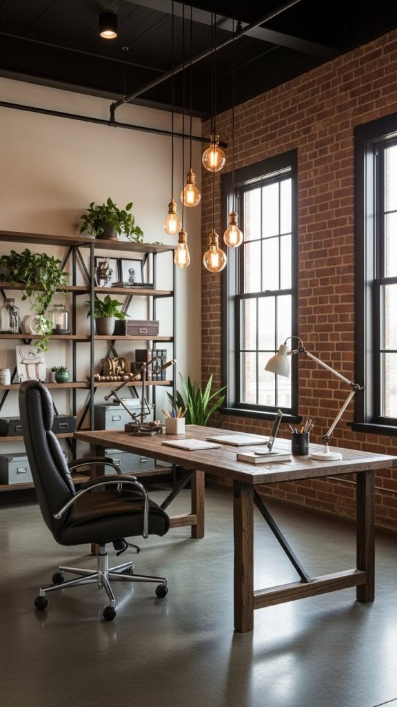 Furniture in industrial offices typically features black metal frames, reclaimed wood desks, iron bookcases, and leather chairs. Lighting plays a major role in this aesthetic. Metal pendant lights, Edison bulb lamps, or matte black floor lamps create an industrial atmosphere while providing practical illumination.