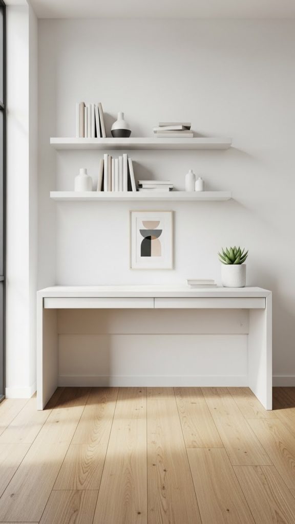 Minimalist design focuses on simplicity, clean lines, and purposeful organization. A minimalist office reduces visual clutter, helping the mind focus. It begins with choosing neutral hues like white, beige, gray, or soft taupe. These colors create a calm environment and make the space appear larger and brighter.