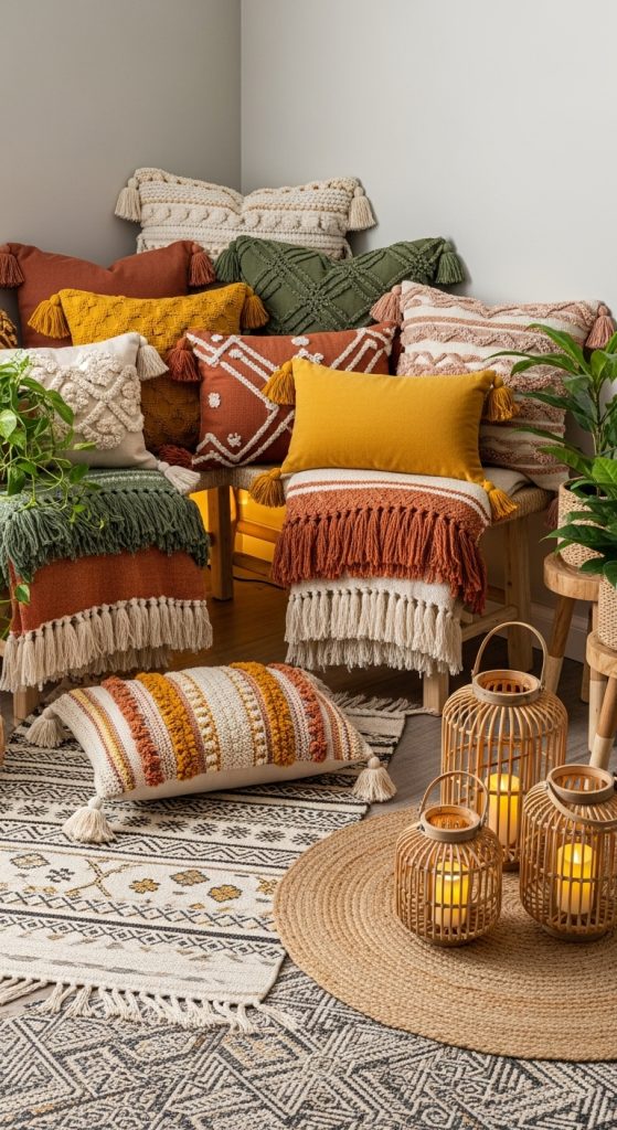 Boho style thrives on layered textiles, earthy tones, and eclectic combinations. This pillow corner is designed to feel free-spirited yet deeply relaxing. Choose pillows with tassels, fringe, embroidery, tribal prints, or soft neutral solids. Layer them generously — the key here is abundance.