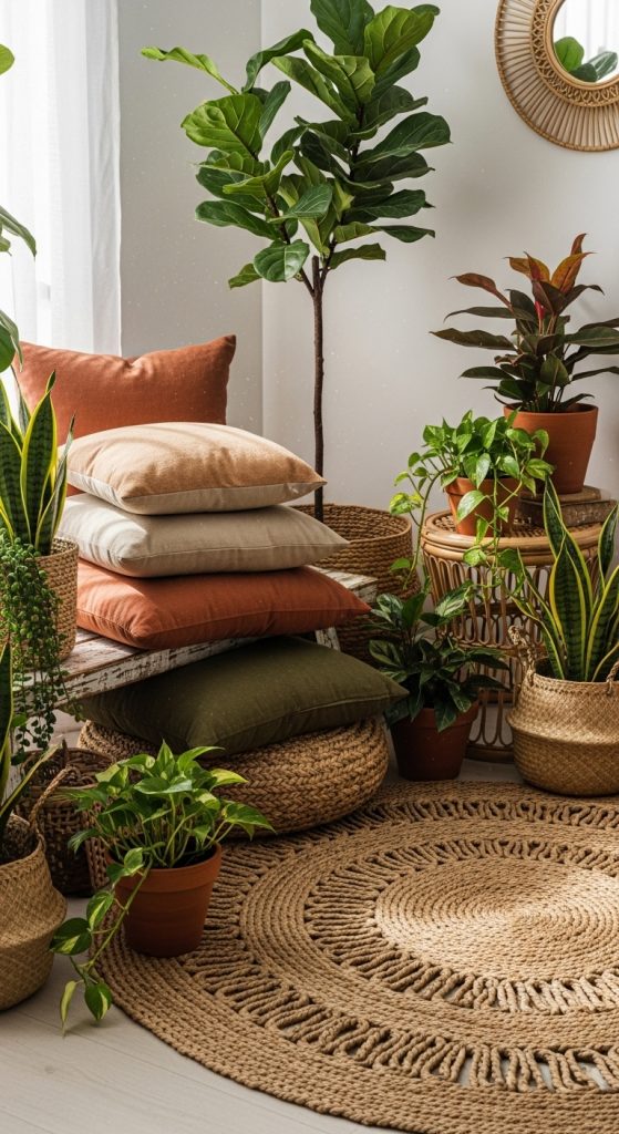 Place several indoor plants around the corner for added freshness. A woven mat or natural-fiber rug makes a perfect base. To bring in nature-inspired accents, add botanical prints, wooden decor, and neutral-toned blankets.