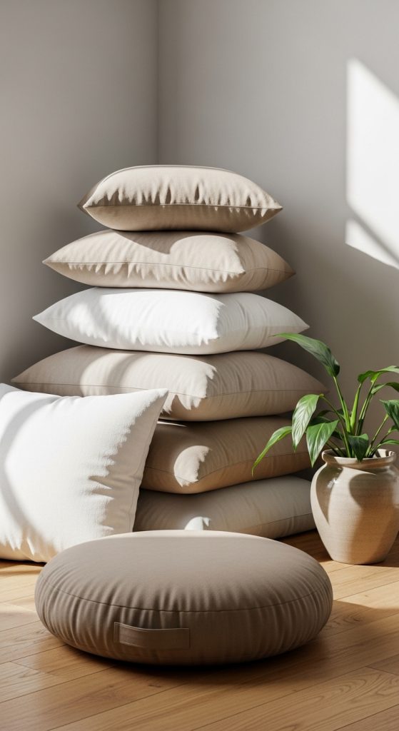 Select a single well-made floor cushion or tatami-style mat as the foundation. Then pick pillows with simple patterns or plain colors. Linen and cotton fabrics work beautifully in minimalist spaces because they look natural and elegant without appearing busy.