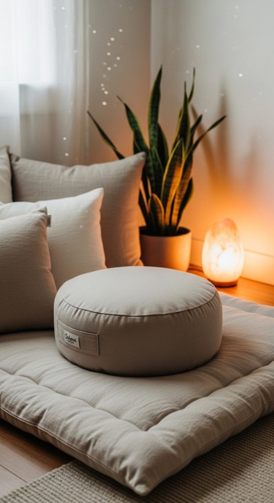 Begin with a meditation cushion (zafu) or thick floor pillow (zabuton). Add one or two supportive back pillows for longer sessions. Keep accessories minimal but intentional: a small table for candles or incense, a plant for visual grounding, or a salt lamp for warm ambiance.
