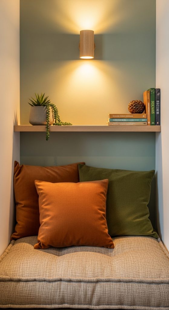 Pillow corners are perfect for wellness routines. Create a meditation-focused corner using calm colors like sage green, beige, soft brown, or muted blue. Choose simple cushions rather than overly decorative ones.