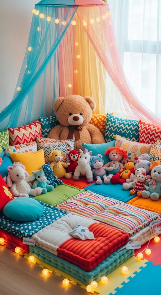 Use a thick foam mat or soft rug to create a safe foundation. Add medium and large pillows along with soft plush toys for additional comfort. A canopy draped above the corner can instantly make the space feel magical. Consider string lights or soft glowing LED stars to create a gentle nighttime atmosphere.