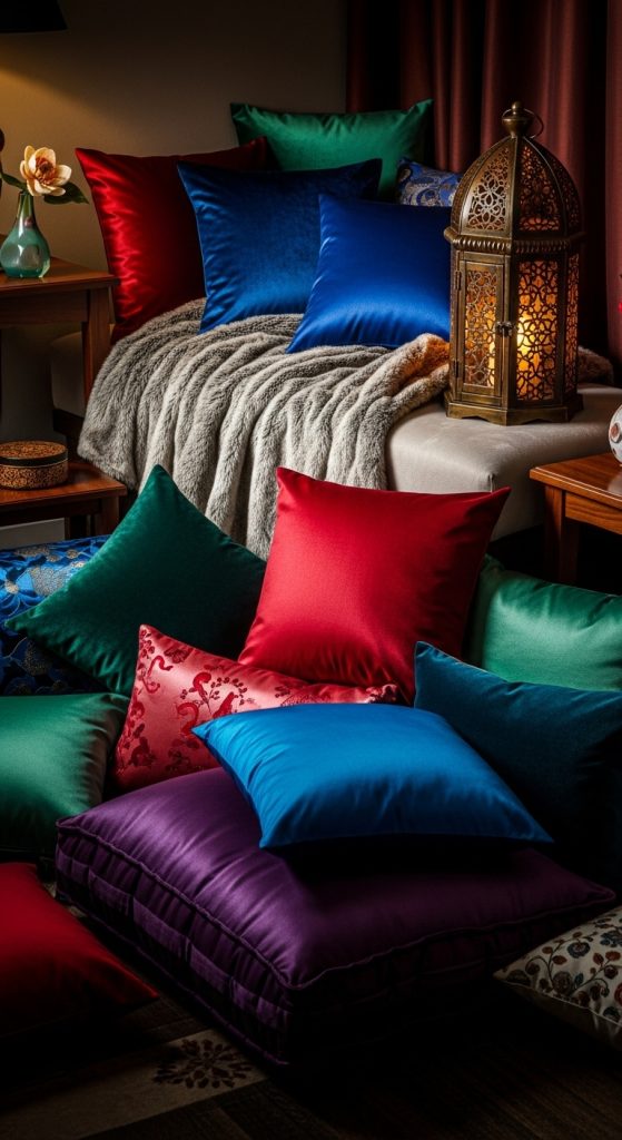 Layer tall back pillows, soft medium pillows, and decorative cushions with patterns such as gold embroidery, textured fabrics, or subtle shimmer. Add a faux fur rug, a high-end throw blanket, or a floor lantern with soft lighting.