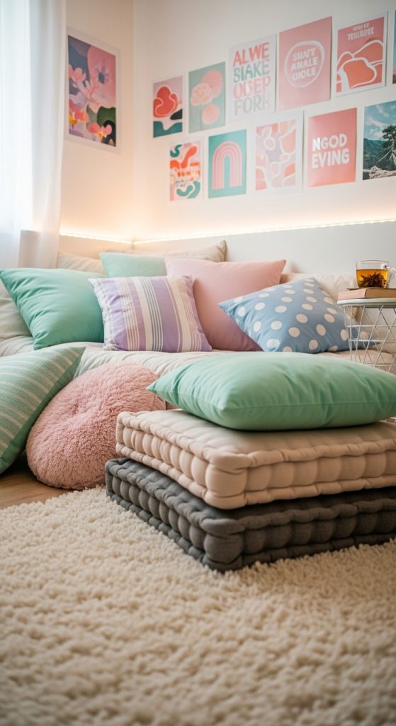 Soft rugs and thick floor cushions are essential for long sitting sessions. This corner becomes a personal sanctuary where teens can unwind in a stylish, personalized environment.
